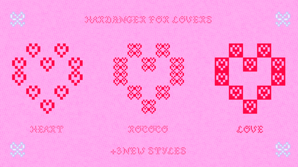 Pixel font, inspired by norwegian's embroideries named Hardanger with a lot of ornament.
